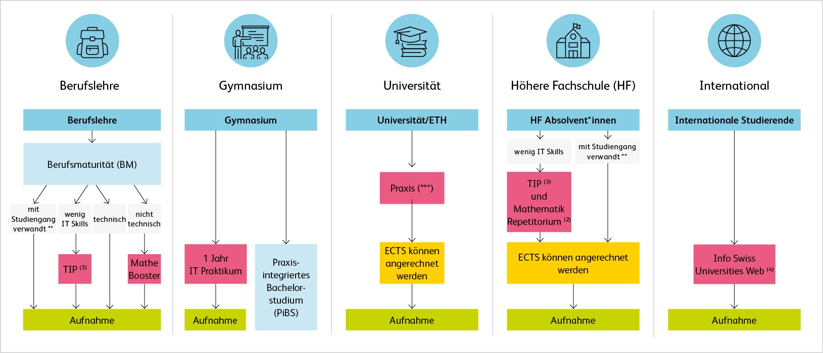 - Schweizerische Berufsmatura mit anerkannter Berufsausbildung. Studierende mit einem nicht-technischen Abschluss oder einer Lehre können aufgefordert werden, Vorbereitungskurse in Mathematik und/oder Informatik zu besuchen.