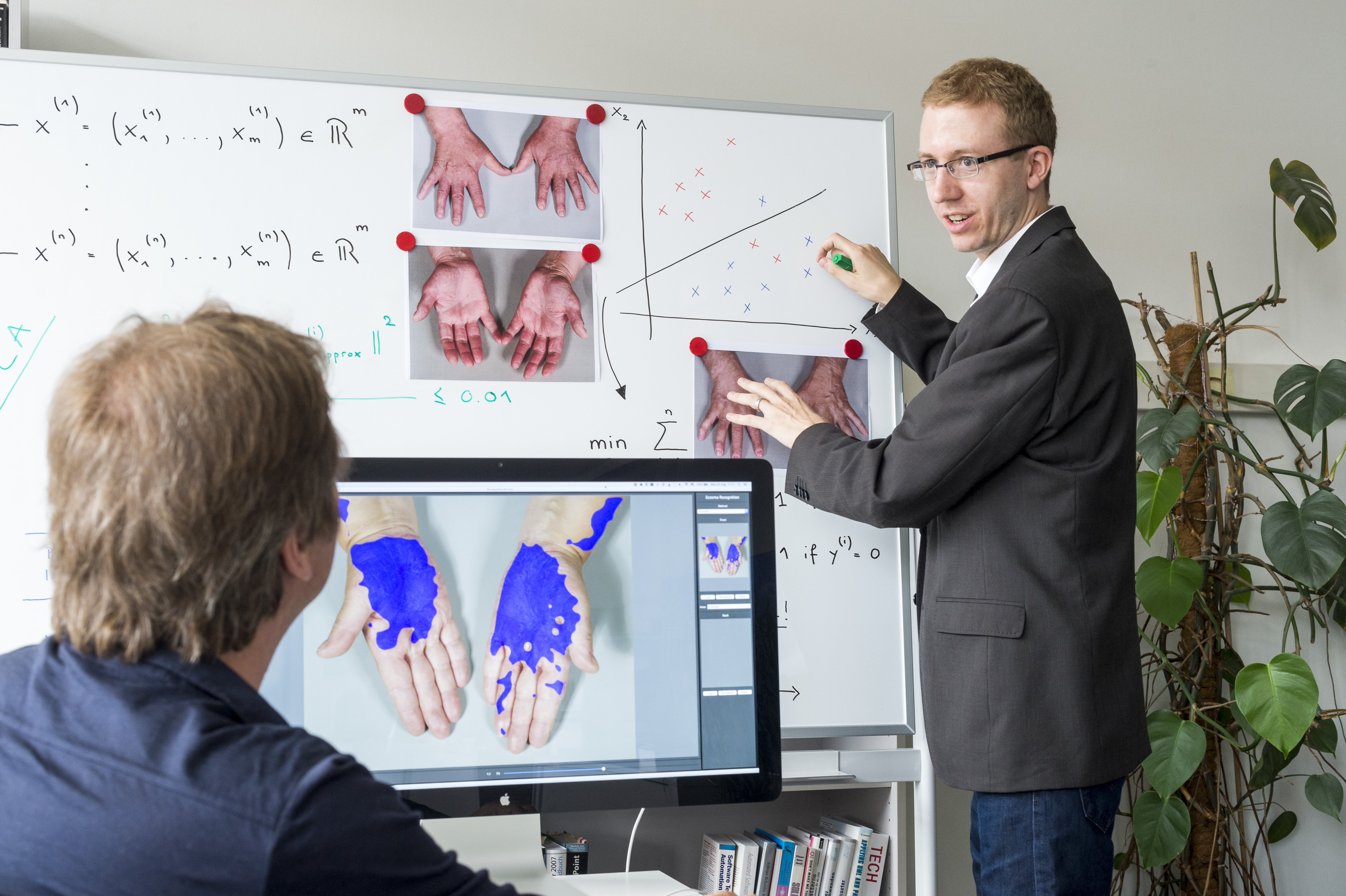 Um Ärzte dazu zu bringen, Fotos erkrankter Hände zu beurteilen, haben die Informatiker Ruedi Arnold und Jörg Hofstetter (Kompetenzzentrum Distributed Secure Software Systems/D3S) die Applikation Skin App Web entwickelt, mit der Ärzte auf der ganzen Welt im Internet ihre Diagnose abgeben können. Denn je mehr Ärzte mitmachen, umso feiner die Diagnosen des Computerprogramms. «Die verschiedenen Teile des Projekts ‹Skin App› können unseren Arbeitsalltag extrem erleichtern, weil sie uns Aufgaben abnehmen, die viel Zeit beanspruchen», sagt Hautarzt Navarini. Das ist für Ärzte günstig – und für Versicherungen.