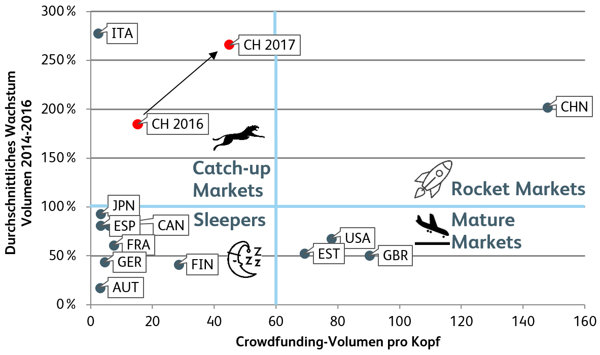 Im Vergleich zu den Nachbarländern ist der Schweizer Crowdfunding-Markt seit 2015 deutlich stärker gewachsen (siehe Grafik). Mit einem investierten Volumen von 45 Franken pro Kopf (2016: CHF 15) liegt die Schweiz im Vergleich zu führenden Crowdfunding-Märkten wie den USA (2016: CHF 78) oder Grossbritannien (2016: CHF 90) noch zwei bis drei Jahre zurück. «Die hohe Dynamik durch neue Plattformen und alternative Geschäftsmodelle lässt aber darauf schliessen, dass die Schweiz gegenüber stark entwickelten Crowdfunding-Ländern aufholt», ergänzt Andreas Dietrich.