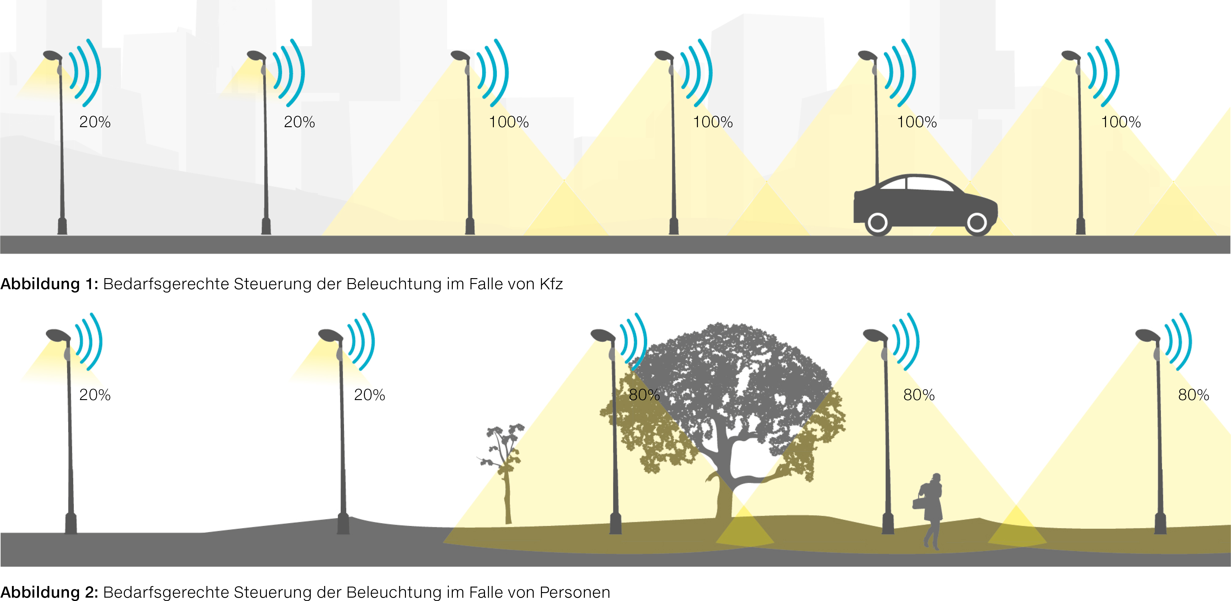 Immer mehr Gemeinden stellen ihre Strassenbeleuchtung auf LED um und sparen dadurch Strom und Kosten. Darüber hinaus lässt sich mit LED und modernen Lichtmanagementsystemen die Beleuchtungsstärke bedarfsgerecht anpassen - ist die Strasse leer, so reicht ein minimales Dimmlevel. Kommt ein Fussgänger oder Auto, so steigt zur Sicherheit die Beleuchtungsleistung an.