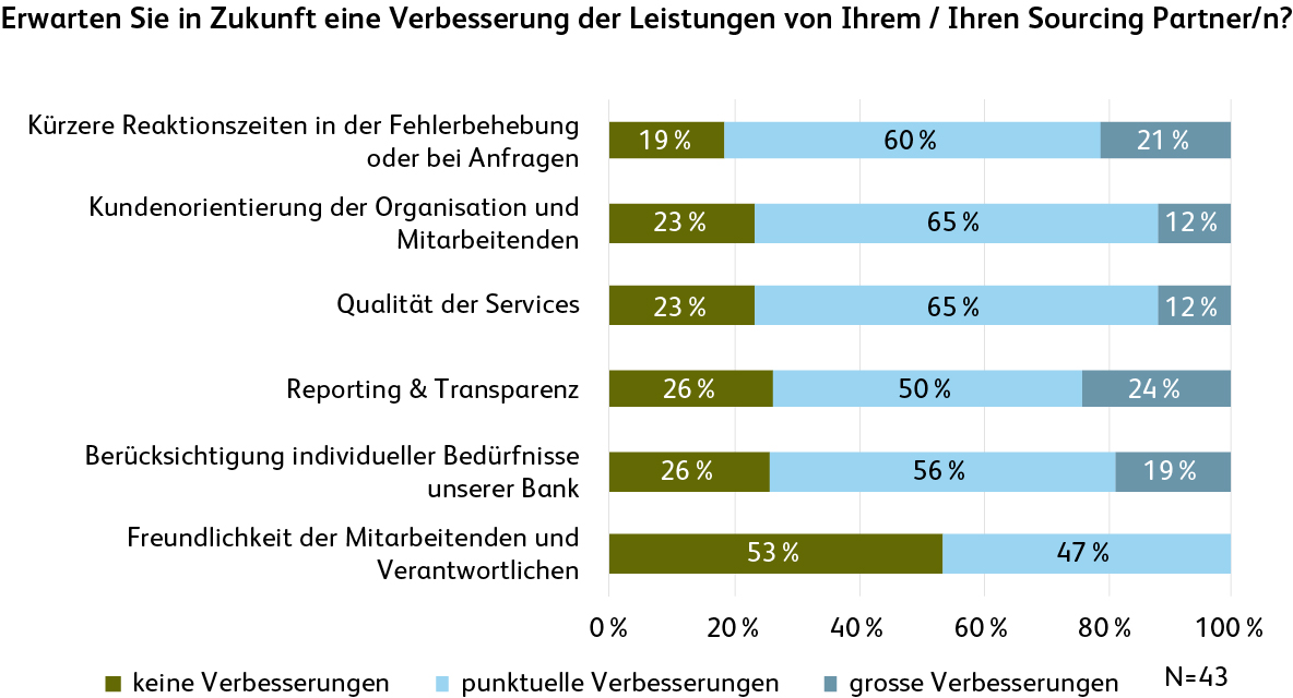 Die Autoren der Studie gehen davon aus, dass der Markt weiter wachsen und sich die Leistungen der Sourcing-Anbieter verbessern wird. «Die Verantwortlichen der Banken planen für die Zukunft in sämtlichen Bereichen weiteres Outsourcing», sagt Studienleiter Urs Blattmann. Fast alle würden sich wieder für ein Outsourcing mit dem bisherigen Partner entscheiden, nur wenige sind mit den Dienstleistungen unzufrieden. Die Zufriedenheit bezieht sich primär auf den täglichen operativen Betrieb, weniger auf die Agilität und Innovation ihrer Sourcing-Anbieter. Das wird sich in Zukunft ändern: Die Beziehung zwischen Banken und Anbietern wird sich mehr hin zu einer Partnerschaft und zu mehr Agilität entwickeln, prognostizieren die Studienautoren.