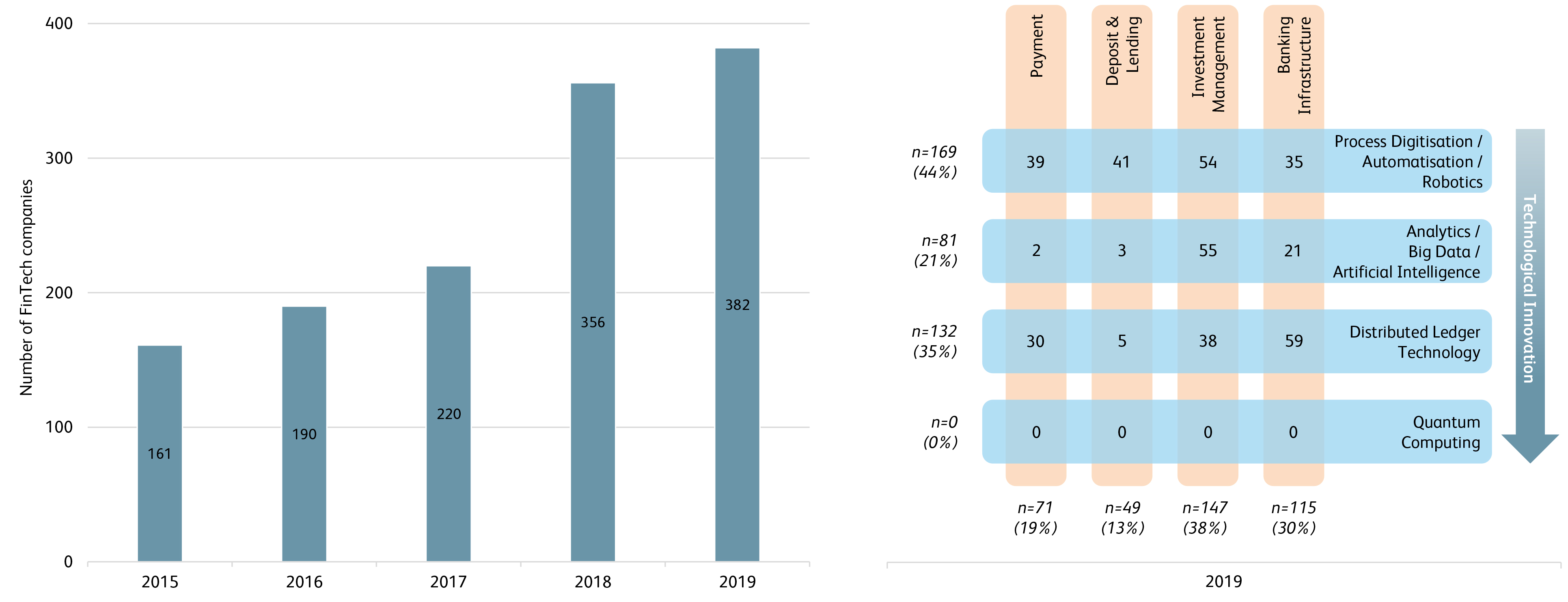 Abbildung 1: Anzahl der in der Schweiz registrierten FinTech-Unternehmen per Ende des jeweiligen Jahres (linke Grafik) und der FinTech-Grid per Ende 2019 (rechte Grafik)