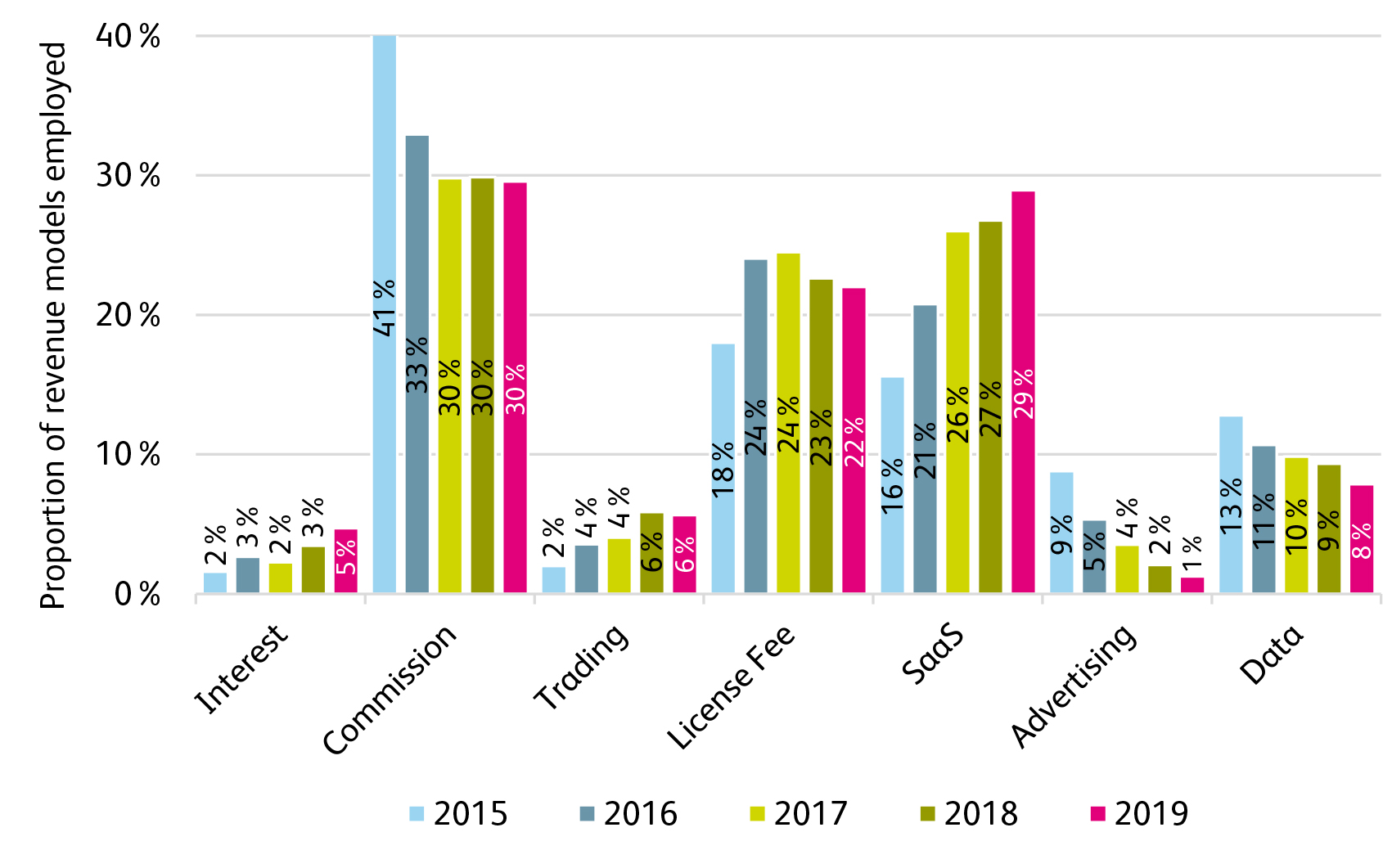 Sieben der zehn global grössten Unternehmen (gemessen an der Marktkapitalisierung per 2019) gehören der Kategorie der BigTechs an. Diese Tatsache unterstreicht die Relevanz von Technologie-getriebenen Geschäftsmodellen. Die steigende Bedeutung von «Tech» gegenüber «Fin» wird auch in den Ergebnissen der Analyse von den von Schweizer FinTech-Unternehmen angewendeten Ertragsmodellen erkenntlich (siehe Abbildung 2). Diese zeigen eine zunehmende Tendenz hin zur Anwendung von IT-typischen Ertragsmodellen. Über die Hälfte der Schweizer FinTech-Unternehmen wenden als Ertragsmodell Lizenzgebühren oder Software-as-a-Service-Lösungen (SaaS) an. Daraus lässt sich schliessen, dass die Bedeutung der IT-typischen Modellen im Vergleich zu den Ertragsmodellen aus dem traditionellen Banking zunimmt. Jedoch wird von Schweizer FinTech-Unternehmen das Kommissionsgeschäft weiterhin am häufigsten verfolgt.