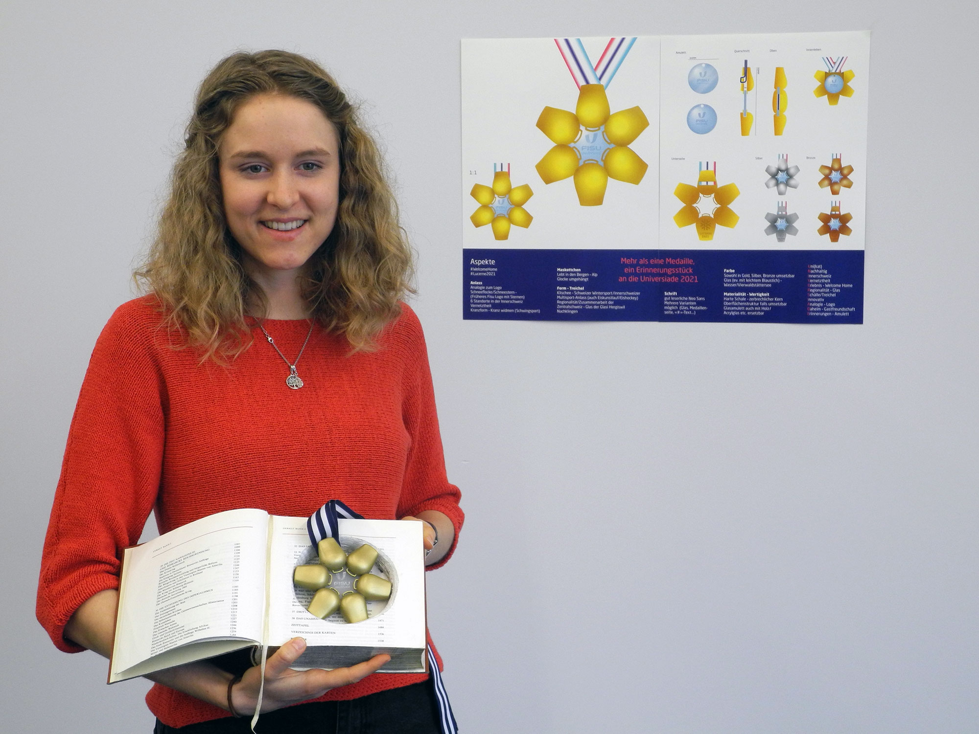 Insgesamt werden am Multisport-Anlass 67 Medaillensätze vergeben. Nicole Schellhammer wurde bei der Erarbeitung der Medaille unter anderem vom Schneekristall im Logo der Winteruniversiade inspiriert. Deshalb hat die Studentin die Anordnung der Trycheln stark an das Logo angelehnt. In der Medaille symbolisieren die Trycheln die Zentralschweizer Kantone, welche den Vierwaldstättersee – in der Medaille das Amulett – umgeben. «Es war mir wichtig, dass die Medaille alle Zentralschweizer Austragungsorte repräsentiert. Zudem sollte das Design für alle Sportarten funktionieren», erklärt Nicole Schellhammer.