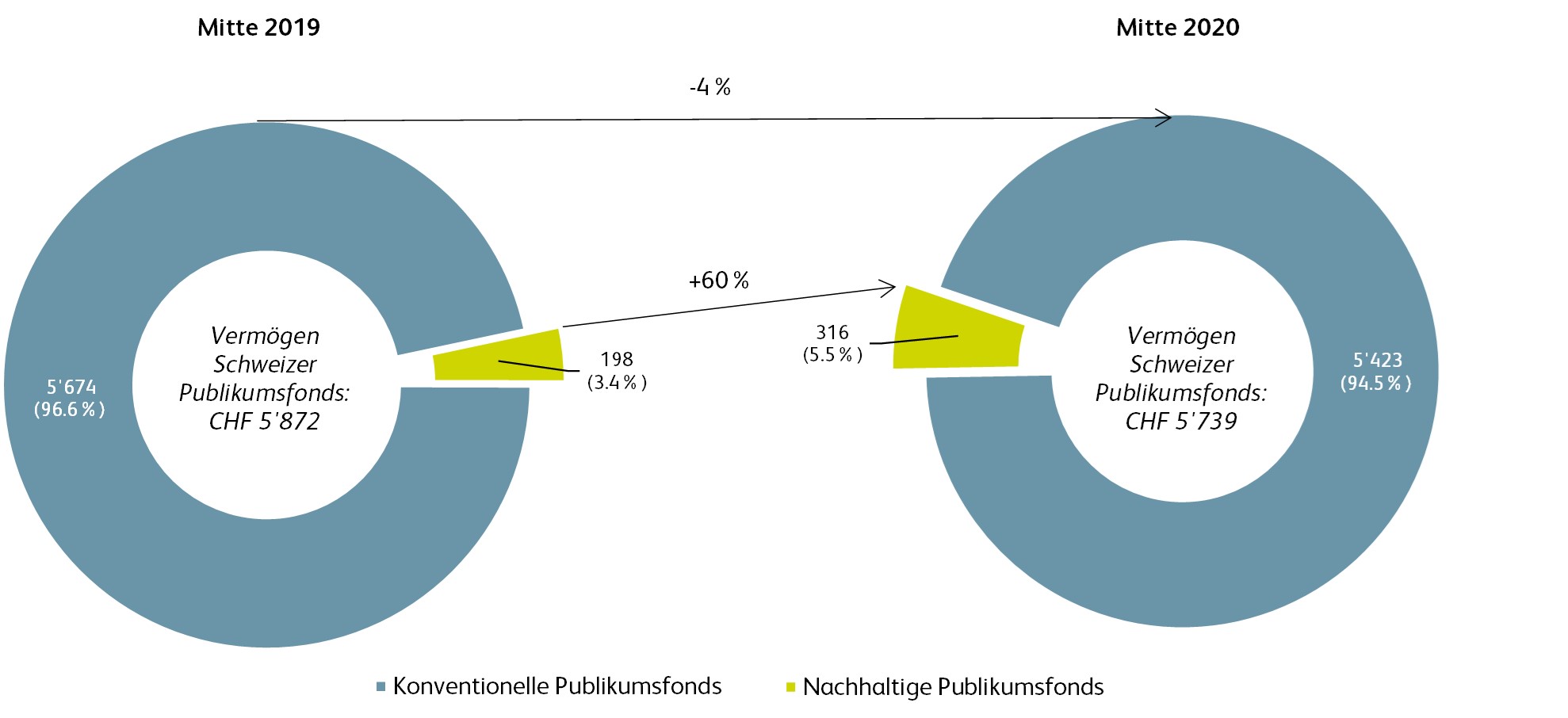 Abbildung 1: Die Entwicklung der Vermögen nachhaltiger und konventioneller Publikumsfonds (in Mrd. CHF, jeweils per 30. Juni)