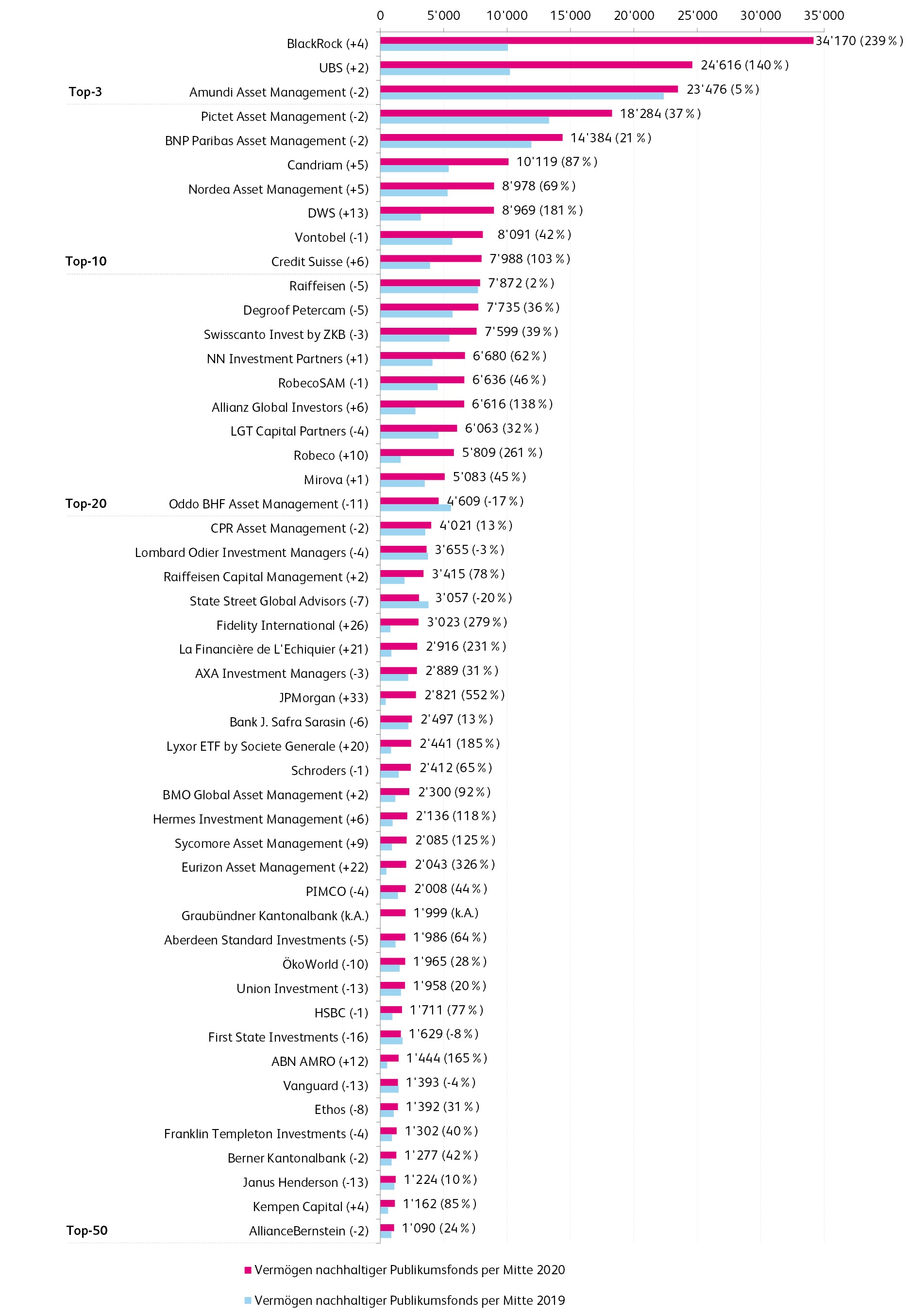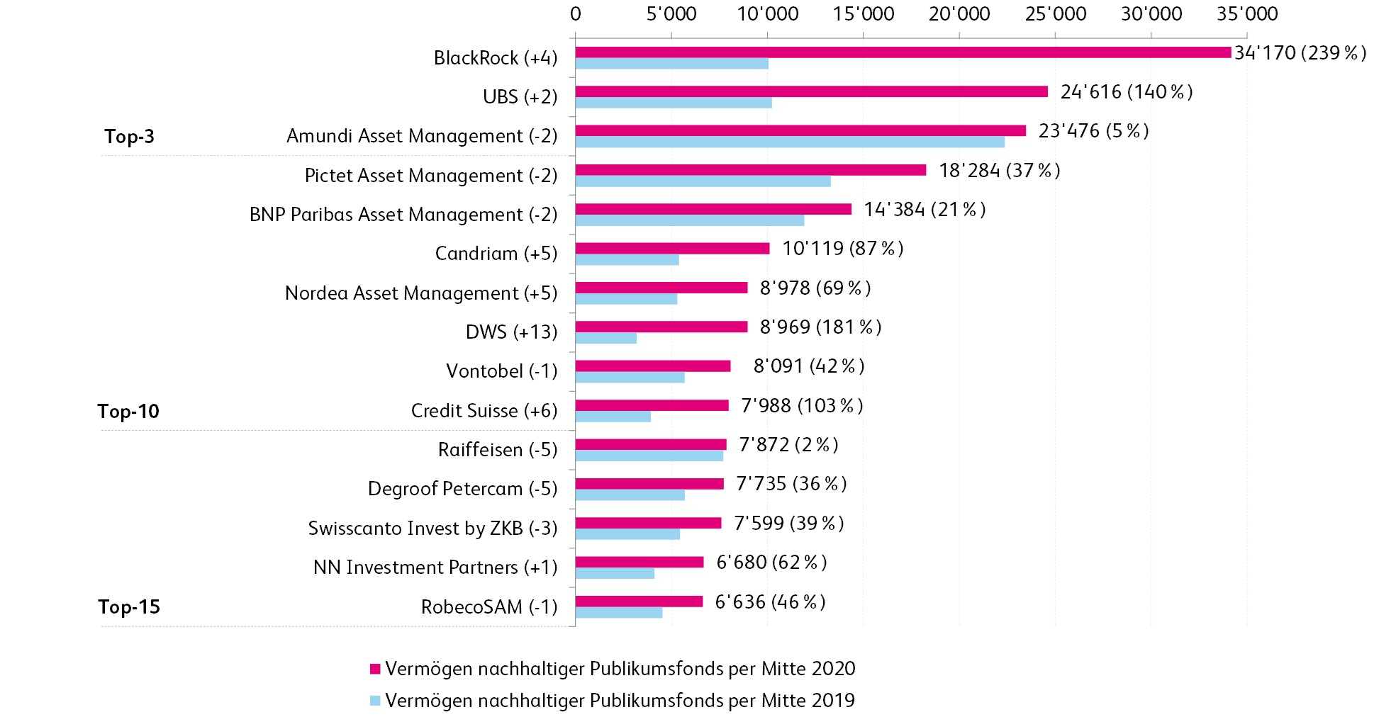 Nachhaltige Investments sind die Gewinner der Corona-Krise: Das Angebot an nachhaltigen Publikumsfonds wächst im Vergleich zum Vorjahr von 595 auf 777 Fonds (+31 Prozent). Die darin verwalteten Vermögen steigen von 198 auf 316 Milliarden Franken (+60 Prozent) – und dies, obwohl der Gesamtmarkt stagniert (Abbildung 1). Knapp sechs Prozent aller Fondsvermögen sind nachhaltig investiert. In der Summe ist das deutlich weniger als die hohe mediale Präsenz des Themas erwarten lässt. Jeder vierte Franken, der neu investiert wird, wird heute allerdings nachhaltig angelegt. Um diese Neugeldzuflüsse herrscht unter den internationalen und Schweizer Anbietern ein intensiver Wettbewerb (Abbildung 2 und Abbildung 3).
