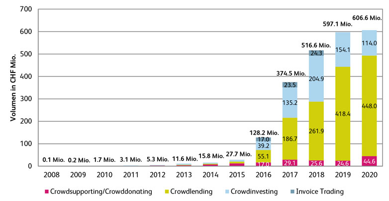 Im Jahr 2020 erreichte das Volumen im Crowdfunding-Markt ein weiteres Mal einen Rekordwert. So wurden über Schweizer Crowdfunding-Plattformen Projekte im Umfang von insgesamt 606.6 Millionen Franken finanziert. Abbildung 1: Entwicklung Crowdfunding-Volumen in der Schweiz 2008 bis 2020 (erfolgreich finanzierte Kampagnen); zum Vergrössern klicken