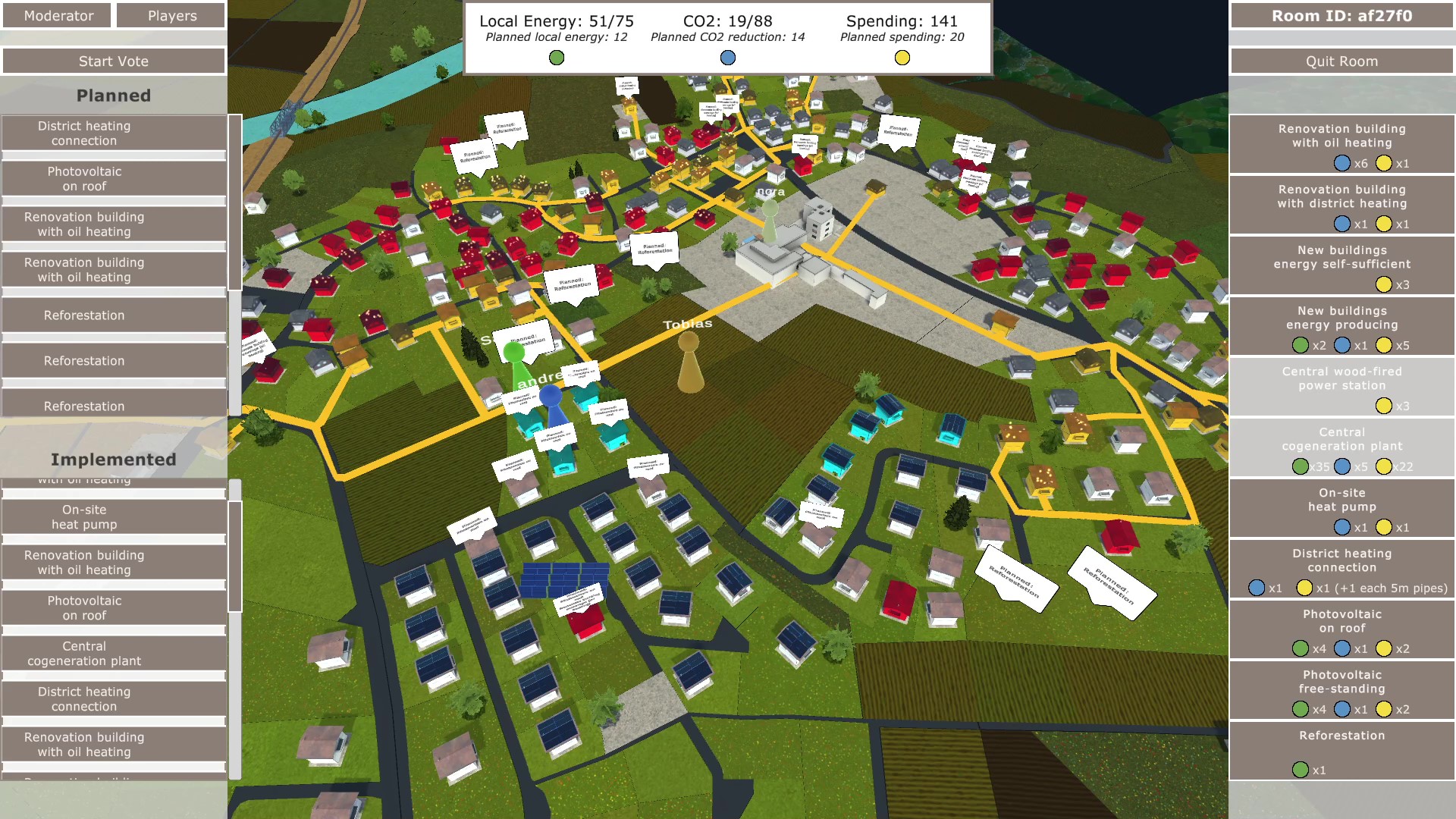 Das Spiel liefere dabei keine perfekten Lösungen, so Schulz weiter. «Politik, Energieversorger und Einwohnerschaft haben teilweise konträre Interessen. Es gilt einen Ausgleich zu finden zwischen den verschiedenen Gruppen, genau wie in der Realität», erläutert er: Reicht es beispielsweise, für wenig Geld Gebäude zu sanieren? Oder ist es doch besser, die Gebäude mit Solaranlagen zu bestücken? Diese senken den CO2-Vebrauch viel stärker, allerdings beeinträchtigen sie das Ortsbild und schaden damit unter Umständen dem Tourismus. Erst wenn im Team Konsens herrscht, welcher Schritt als nächstes in Angriff genommen werden soll, geht das Spielt weiter