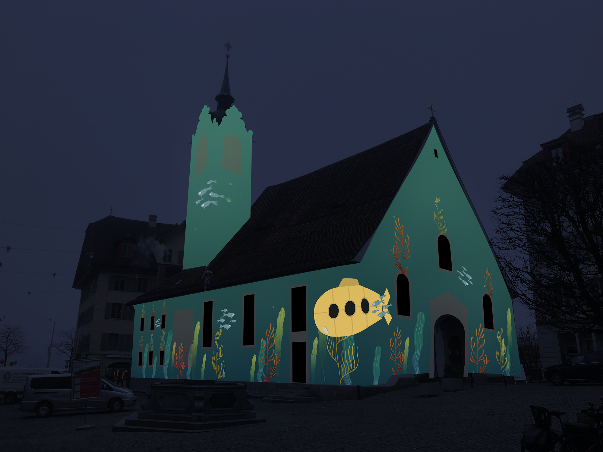 Studierende im zweiten Jahr des Bachelor Animation stellen mit der Installation «Der Vögel täglich Brot» die Reise eines Brotes nach, das ein Junge aus Versehen in den Vierwaldstättersee fallen lässt. Der Laib wird gierig von Vögeln auseinandergepickt. Dabei wandern die Brotstücke von Schnabel zu Schnabel, durch eine farbenfrohe Unterwasserwelt und durch das Stadtbild Luzerns bis hin zur Peterskapelle. Die Fassade der Kirche dient den Studierenden auch als Projektionsfläche für ihre humorvolle Geschichte.