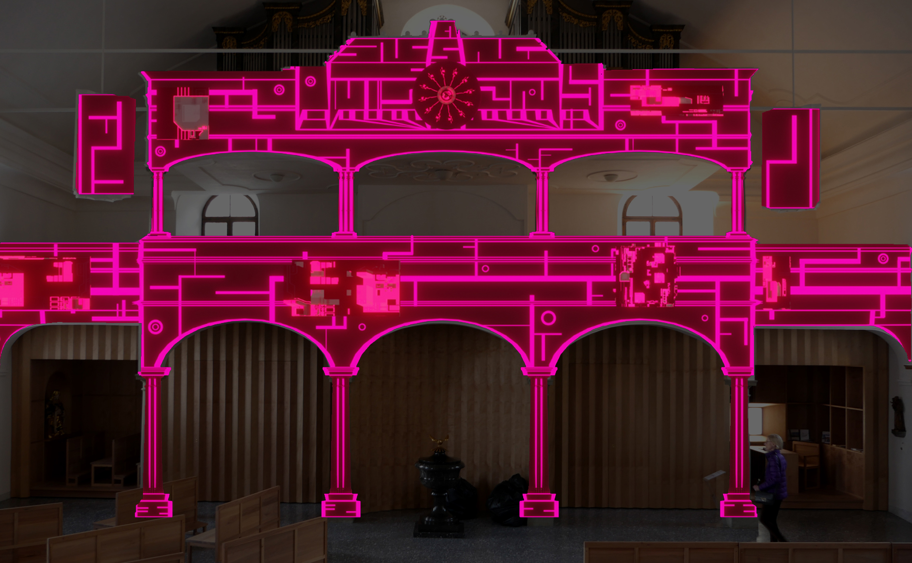 «Circles and Squares» ist eine Zusammenarbeit der Departemente Design & Kunst und Musik der Hochschule Luzern: Studierende aus dem ersten Jahr im Bachelor Animation entwickeln für die Lichtinstallation in der Luzerner Peterskapelle kurze Geschichten ausgehend von Kreisen und Quadraten. Die geometrischen Formen werden zu einer längeren Erzählung aneinandergereiht und auf die Empore der Kirche projiziert. Die Begleitmusik zur Show steuern Studierende des Departements Musik bei.