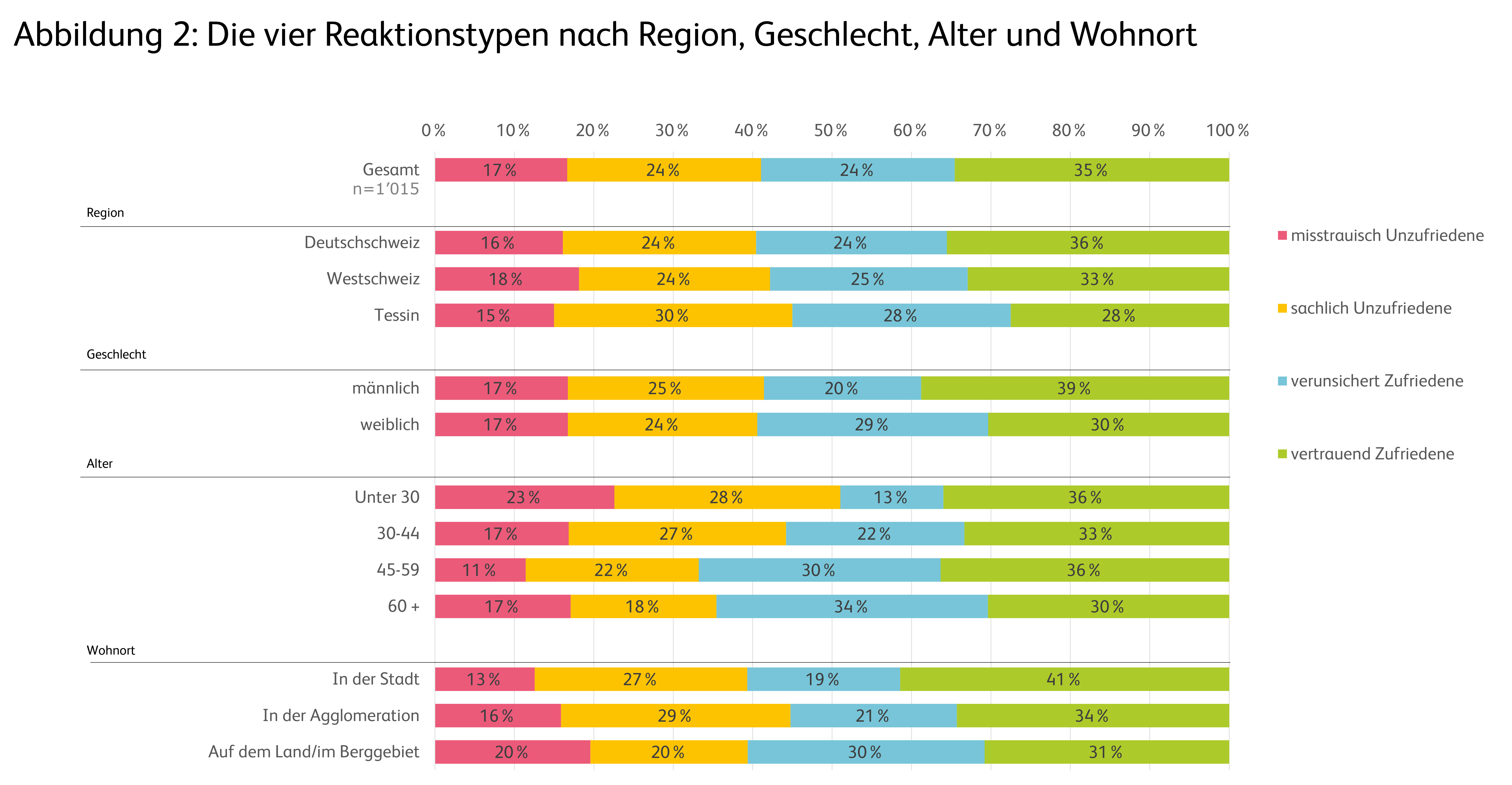 Bei den Unter-Dreissigjährigen ist der Anteil der Unzufriedenen am grössten. Etwas mehr als die Hälfte aller befragten Personen in dieser Altersgruppe gehört entweder zu den misstrauisch Unzufriedenen oder zu den sachlich Unzufriedenen (Abbildung 2: Die vier Reaktionstypen nach Region, Geschlecht, Alter und Wohnort; zum Vergrössern klicken).