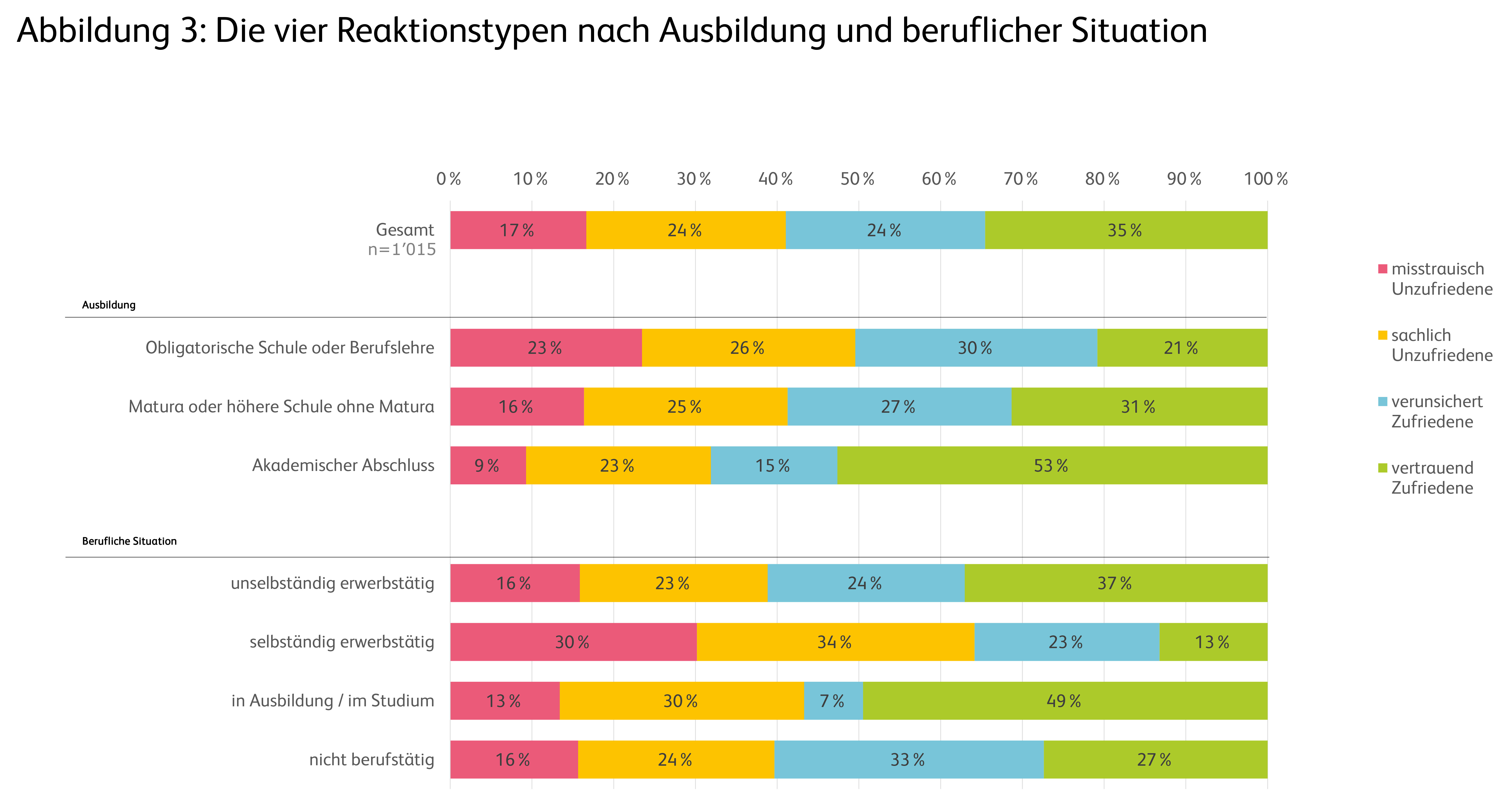 Selbstständig Erwerbstätige gehören deutlich häufiger zur misstrauisch unzufriedenen Bevölkerungsgruppe (30 Prozent). Derweil ist bei den unselbständig Erwerbstätigen der grösste Teil mit der Kommunikation der Behörden und Medien zufrieden (Abbildung 3: Abbildung 3: Die vier Reaktionstypen nach Ausbildung und beruflicher Situation; zum Vergrössern klicken).