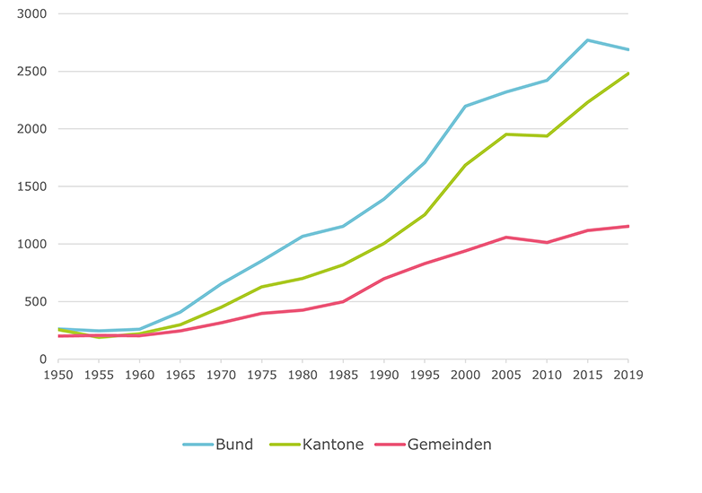 Abbildung 1: Der starke und kontinuierliche Anstieg der Sozialausgaben ab den 1960er Jahren zeigt, wie Bund und Kantone vermehrt die Gemeinden in sozialen Belangen unterstützten. Dies wirkte sich auch aufs Heimwesen aus: Durch die höheren finanziellen Beiträge übernahmen Bund und Kantone zunehmend Steuerungs- und Kontrollfunktionen.