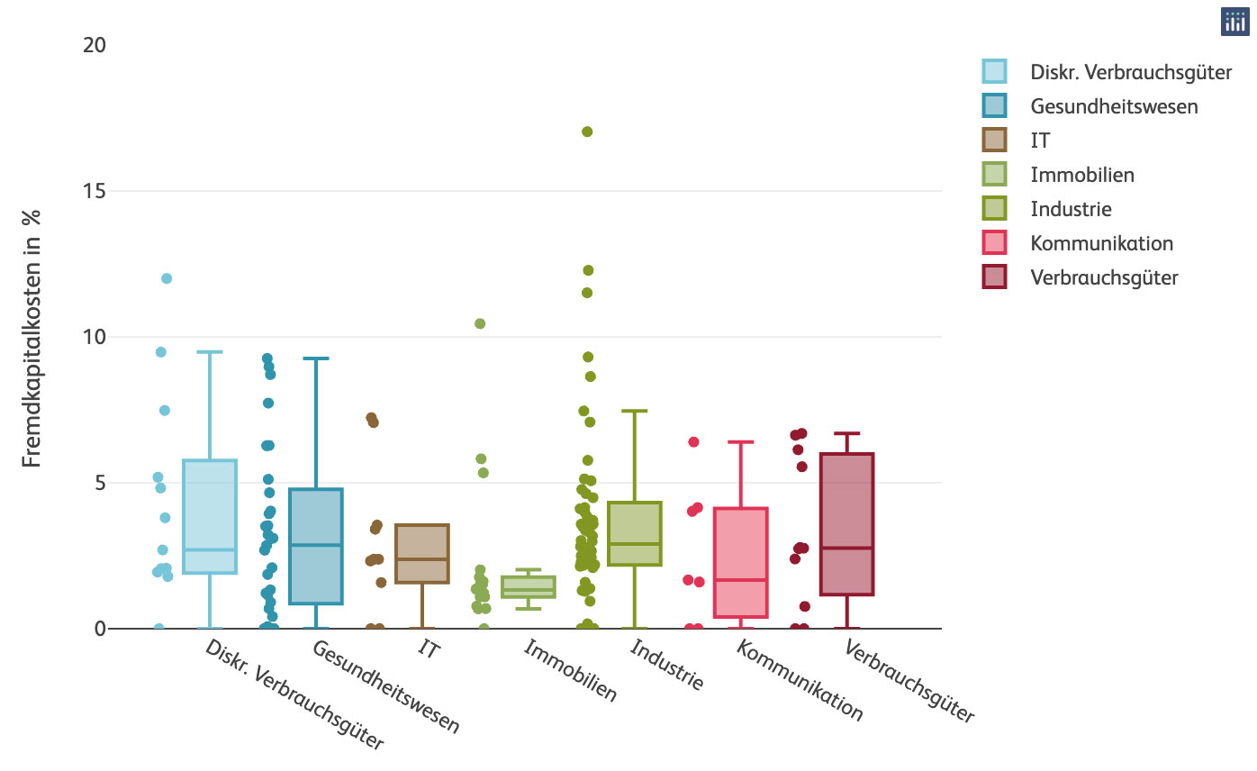 Abbildung: Die Industrieunternehmen weisen den höchsten Fremdkapitalkosten auf. Deutlich tiefer sind sie in der Immobilienbranche. [Zum Vergrössern klicken]