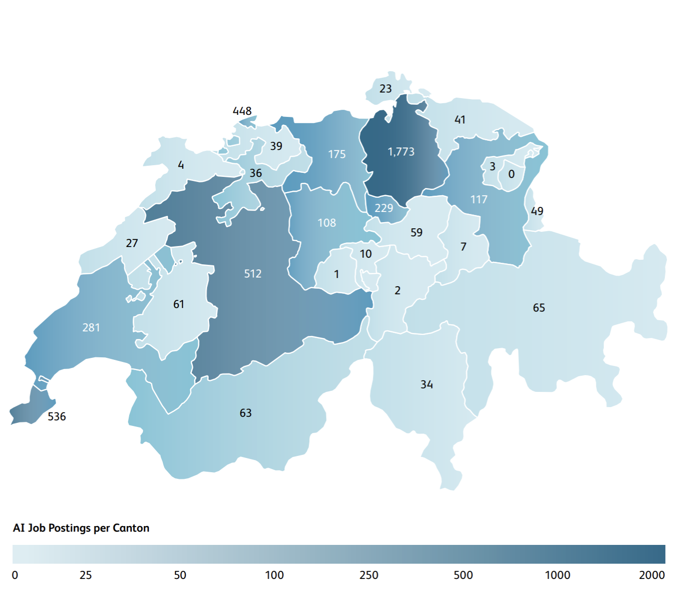 Von insgesamt 4'703 KI-Stellen in der Schweiz entfallen 1'773 – also über 37 Prozent – auf die Region Zürich. Bedeutende Cluster finden sich zudem in Genf (536), Bern (512), Basel-Stadt (448), Waadt (281) und im Kanton Zug (229).