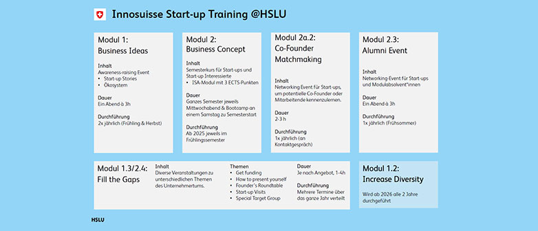 Gemeinsam mit Innosuisse – der Schweizerischen Agentur für Innovationsförderung – bieten wir Ausbildungsmodule sowie Events im Bereich Entrepreneurship an. Zudem hast du die Möglichkeit, im Rahmen deines Studiums ISA-Module zu absolvieren.