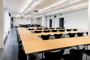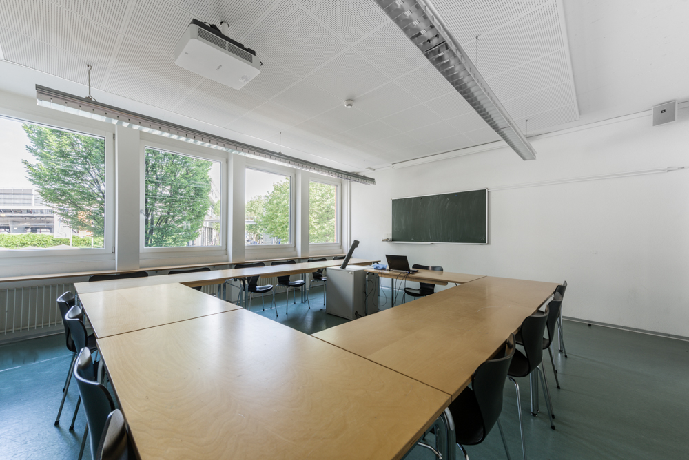 Raum mit Plenumsbestuhlung. Geeignet für Vorlesungen, Konferenzen und Unterricht.