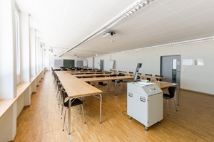 Klimatisiertes Auditorium für Tagungen, Seminare, Prüfungen, Vorlesungen. Fix möbliert mit abgestuften Sitzreihen.