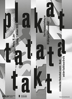 Breadcrumbs-Navigation Musik Agenda plakattatatatakt plakattatatatakt Eine Plakatausstellung zur 30-jährigen Zusammenarbeit zwischen der Hochschule Luzern – Musik und der Fachklasse Grafik MO 11. August bisFR 17. Oktober 2025 Veranstaltungsort Hochschule Luzern – Musik Arsenalstrasse 28a, Foyer 6010 Luzern-Kriens Auf Google Maps anzeigen Teilen Seit 1994 entsteht jedes Jahr ein einzigartiges Plakatmotiv für die Diplomkonzerte der Jazz-Absolvent:innen – gestaltet von Schülerinnen und Schüler der Fachklasse Grafik. Die Ausstellung zeigt alle bisherigen Sujets und dokumentiert eine kreative Partnerschaft voller Klang, Farbe und Haltung. Die Plakate sind Ausdruck der Themen, die junge Gestalter:innen und Musiker:innen bewegen – von Rhythmus und Zeitgeist bis zu Experiment und Emotion. Sie machen die künstlerische Ausbildung an der Hochschule Luzern – Musik und der Fachklasse Grafik sichtbar.