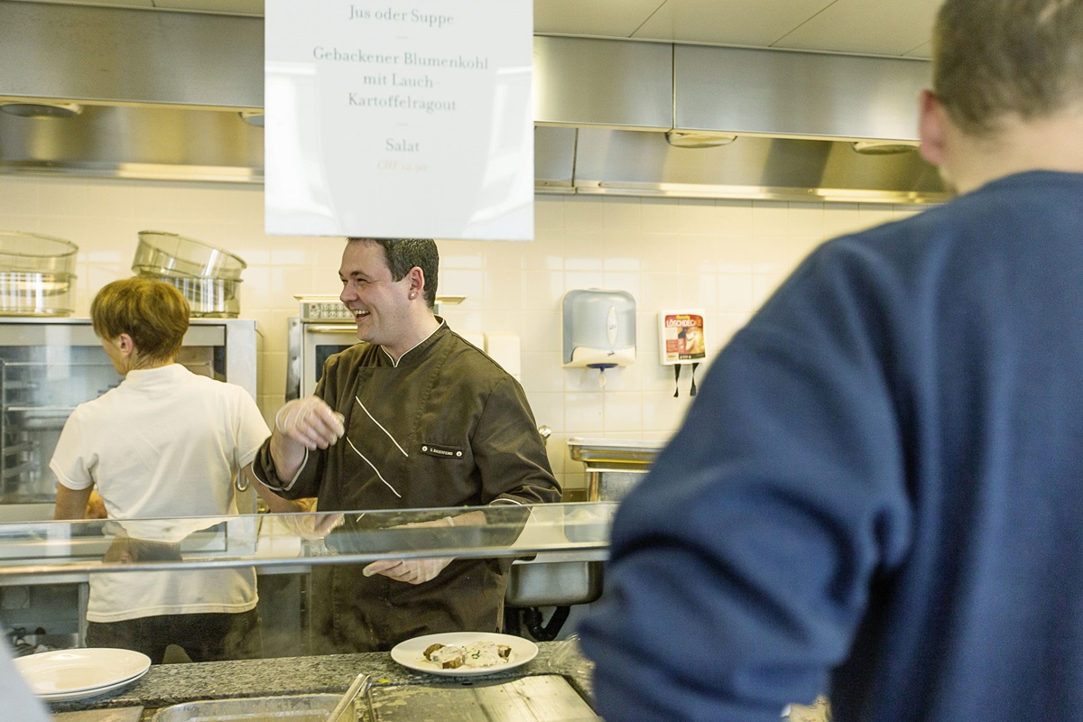 In der Mensa der Hochschule Luzern – Soziale Arbeit finden Studierende und Mitarbeitende eine grosse Auswahl an Mittagessen, Getränken, Süssigkeiten, Sandwiches und Früchten.