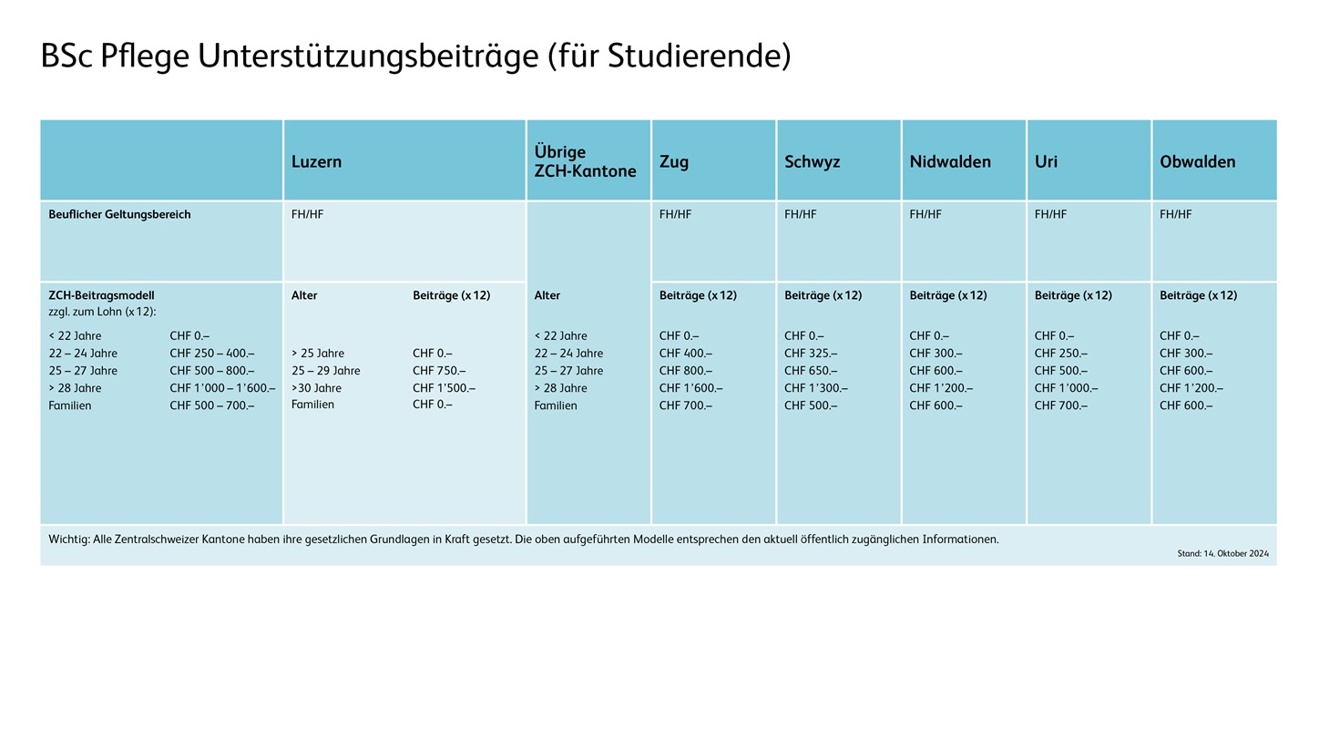 Die Zentralschweizer Kantone gewähren ihre Ausbildungsbeiträge abgestuft nach Alter und – mit Ausnahme des Kantons Luzern – unter Berücksichtigung von Familienpflichten. Diese Beiträge ergänzen die Praktikumslöhne, die von den Ausbildungsbetrieben an die Studierenden ausgezahlt werden.