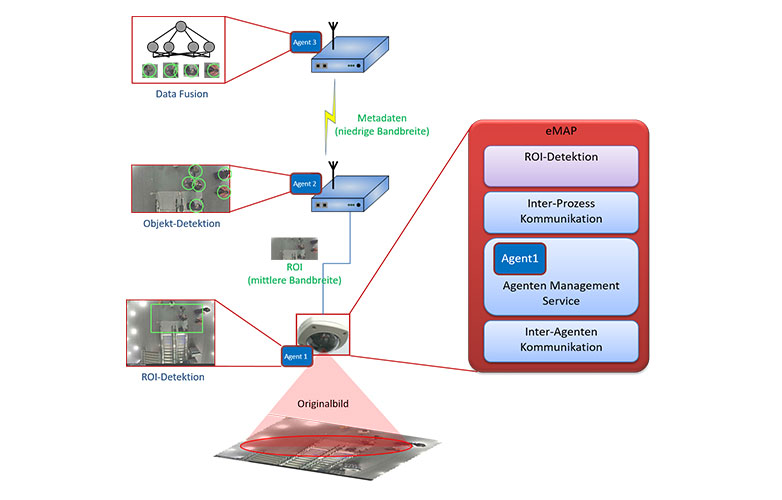 Allerdings verhindern die hohen Kosten bisher den breiten Einsatz von Vision-Sensorik, denn diese basiert auf einer Architektur, bei der die rechenintensive VCA-Verarbeitung auf dedizierten Prozessoren ausgeführt wird, zu denen die gesamte Bildinformation von den Kameras über teure IP-Netzwerke übertragen werden muss. Auch sog. «Intelligente Kameras», bei denen die VCA-Verarbeitung auf dedizierter Hardware innerhalb der Kamera geschieht, und die nur noch sog. Metadaten wie z.B. Zähldaten ausgeben, sind sehr teuer, was sich ungünstig insbesondere für grössere Installationen auswirkt.