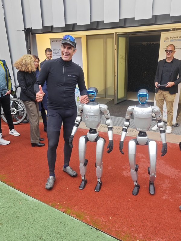 Mit vollem Einsatz für den Engineers’ Day: Das Team ist mit dem Fahrrad von Muttenz bis nach Horw gefahren – ganze 106 Kilometer – um den symbolischen Stab von der FHNW, der letztjährigen Gastgeberin, an die Hochschule Luzern zu übergeben. Empfangen wurde die Gruppe vor dem iHomeLab – inklusive der beiden humanoiden Roboter, die zuvor in der Stadt unterwegs waren und auch Star des Empfangs waren.