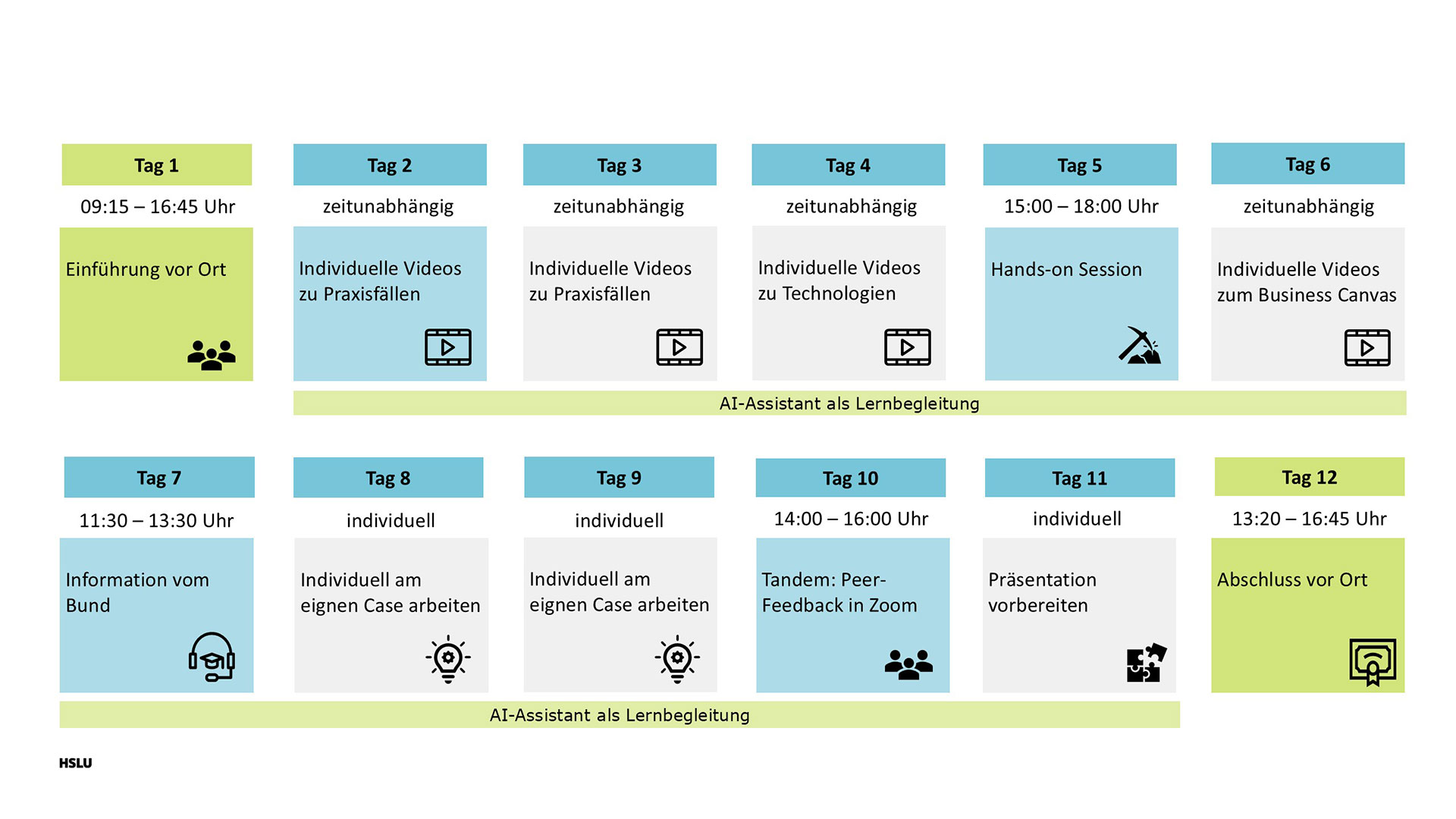 Das SAS nutzt ein hybrides, kompaktes Lernformat aus zwei Präsenz-Halbtagen, acht Selbststudium-Modulen (à 20-30 Minuten) und vier Live-Sessions (à 30-90 Minuten).