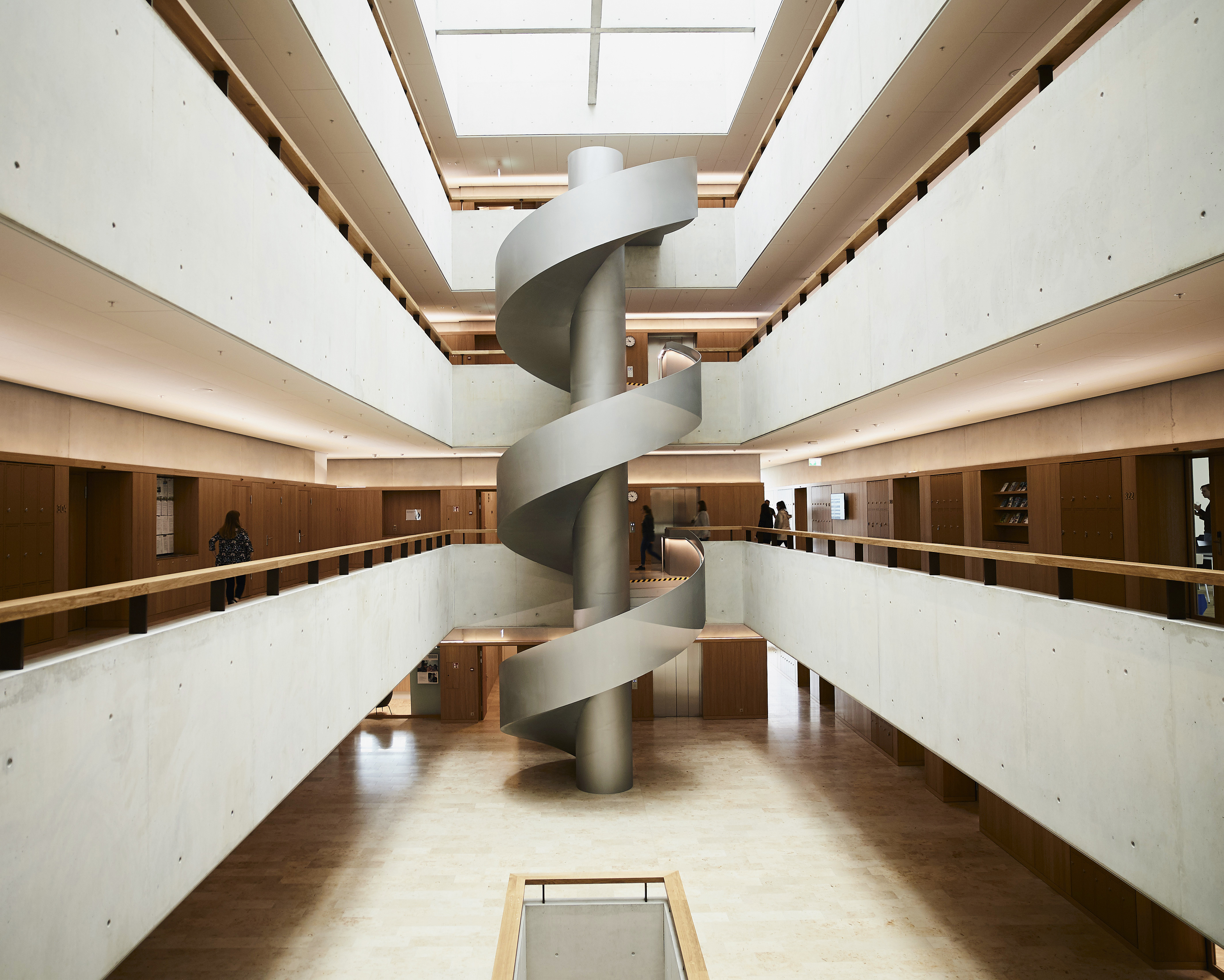 Die Wendeltreppe in der grossen Halle gehört zu den Wahrzeichen des Campus Zug-Rotkreuz.