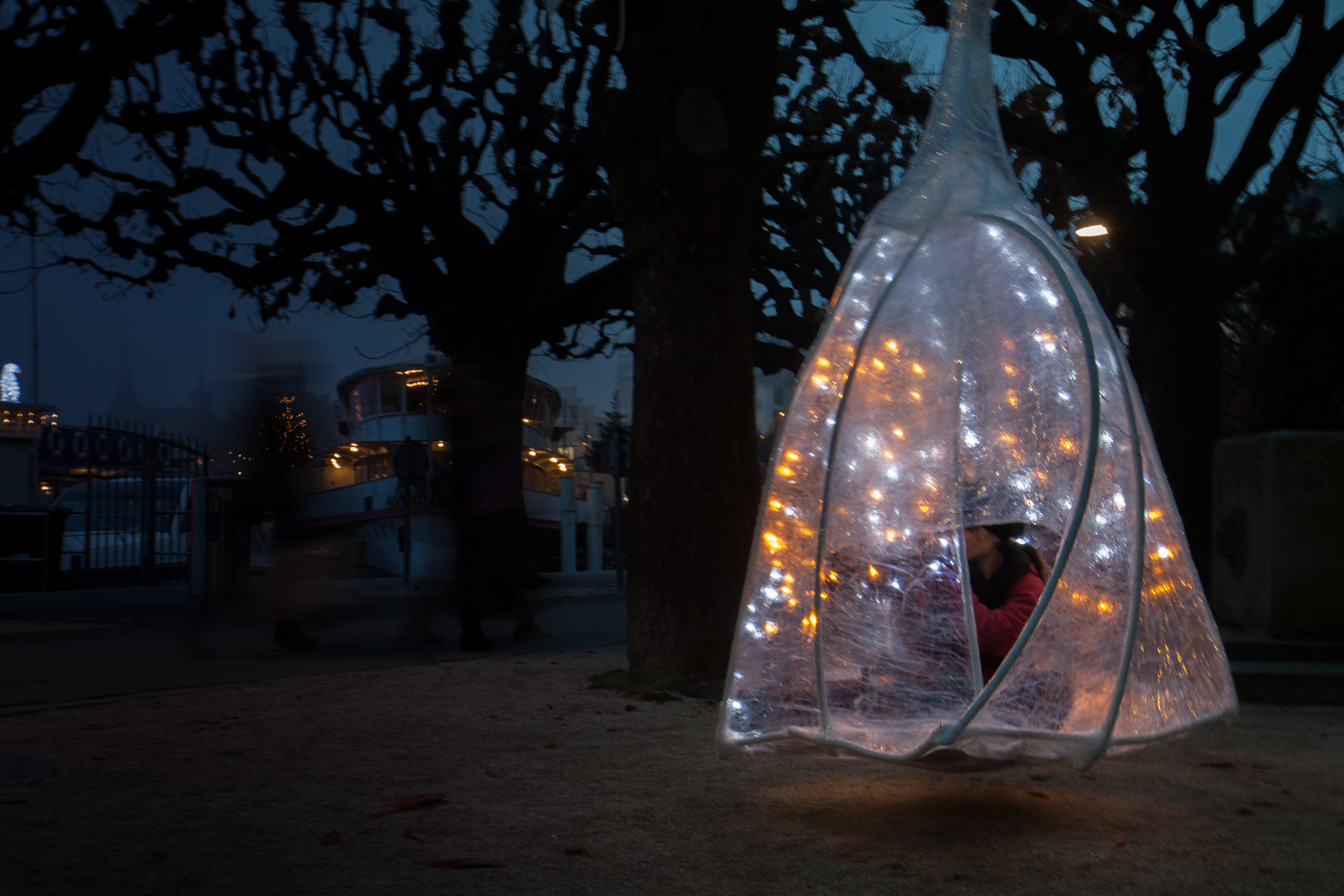 Da ist beispielsweise der leichte Aerospace «The shell» aus Aluverbundrohren und Klebeband, den die Studierenden an Bäumen auf dem Luzerner Kurplatz aufhängten. «Losing feet» eines weiteren Teams besteht aus Holz und Einkaufstaschen, dieser Aerospace wurde im Gigeliwald Luzern getestet. Für das Projekt «Woven cradle» zerschnitten die Studierenden Betonverschalungen aus Holz in vier Millimeter dicke Streifen und flochten daraus einen Arbeitsplatz, der einem Kokon ähnelt. Aufgehängt wurde er in einem Wald im Aargau.