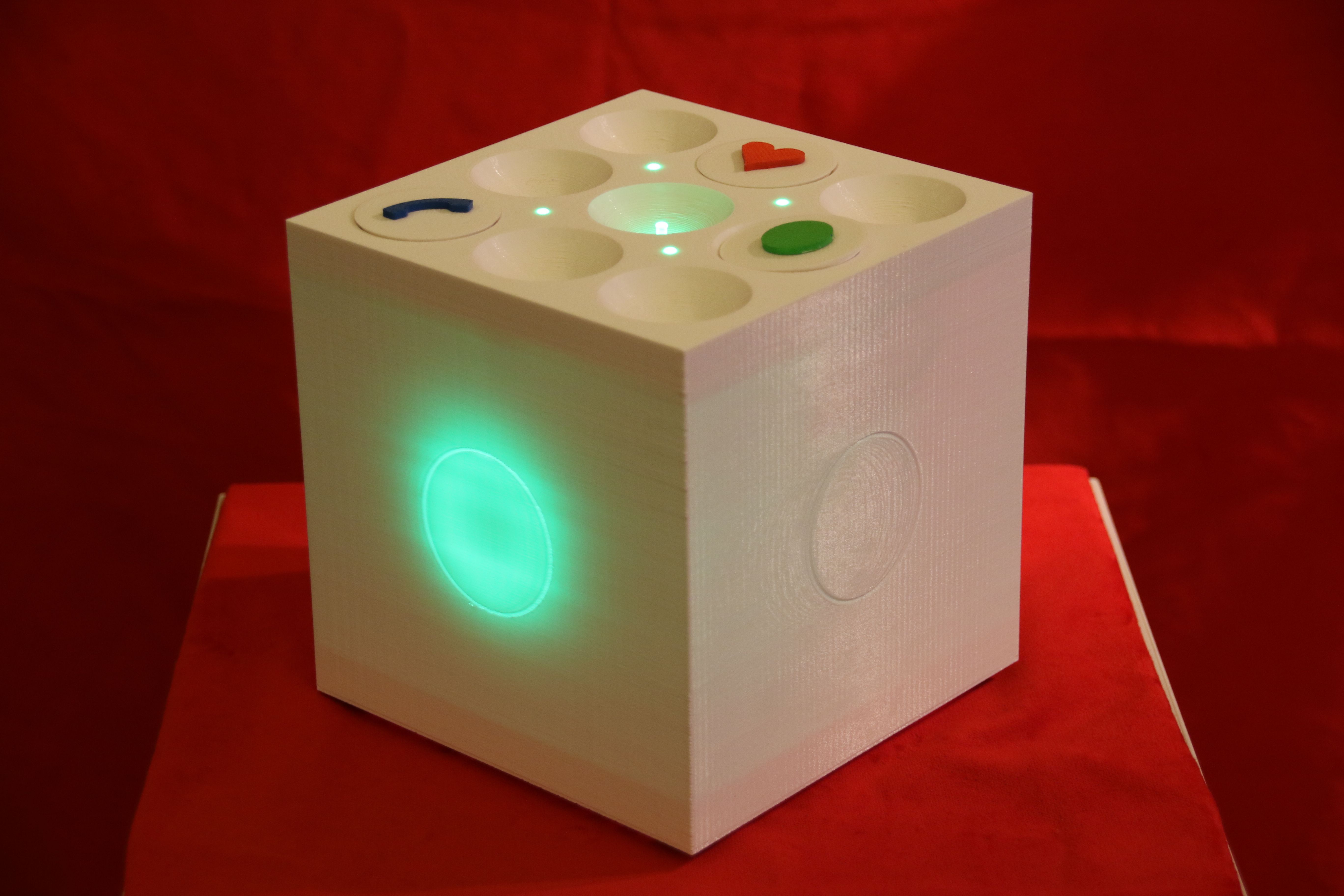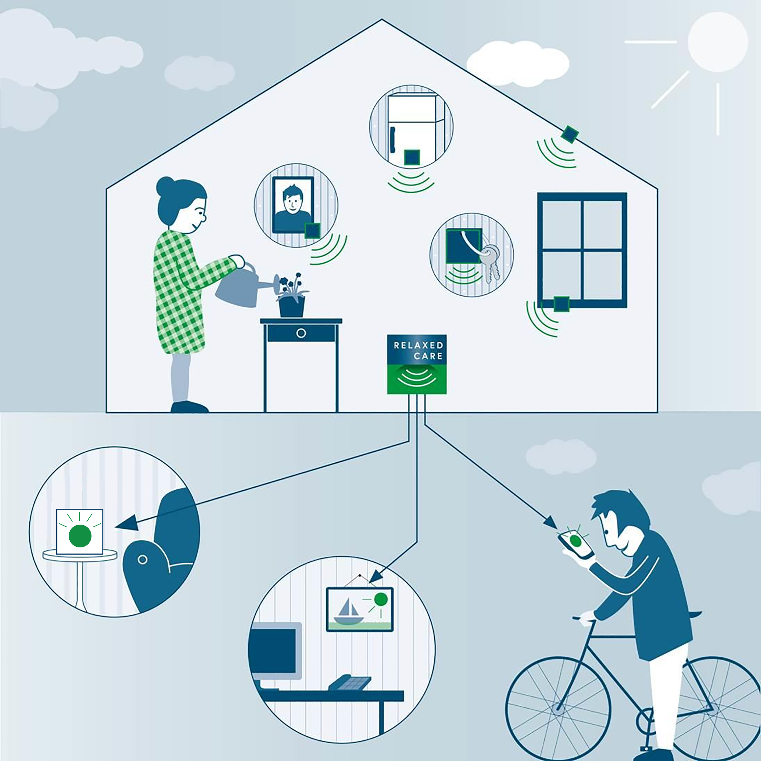 Das ist «Relaxed Care»: Je ein dekorativer Würfel, beispielsweise aufgestellt in der Wohnung einer alleinlebenden, älteren Mutter und in jener ihres erwachsenen Sohnes, stellt eine ständige Verbindung zwischen den beiden her. Die Würfel zeigen an, ob es dem anderen gut geht, ob er oder sie aktiv ist oder Gesellschaft möchte. Sensoren in der Wohnung stellen Änderungen im Lebensrhythmus der Personen fest. Ist alles im gewohnten Bereich, schimmert der Würfel grün. Weicht der Rhythmus auffällig ab, wechselt der Würfel die Farbe. Zudem können mit Hilfe von Kugeln, die in Vertiefungen des Würfels gelegt werden, auch direkte Botschaften ausgetauscht werden. Ergänzt wird das System durch eine Smartphone App, welche über dieselbe Funktionalität wie der Würfel verfügt, so dass die Funktion auch ausserhalb der Wohnung verfügbar ist. «Das System soll nicht als Überwachungssystem verstanden werden. Vielmehr soll es auf dezente Art eine ständige Verbindung zwischen älteren Personen und ihren Angehörigen herstellen und sie so zusätzlich aufeinander aufmerksam machen», erklärt Alexander Klapproth.