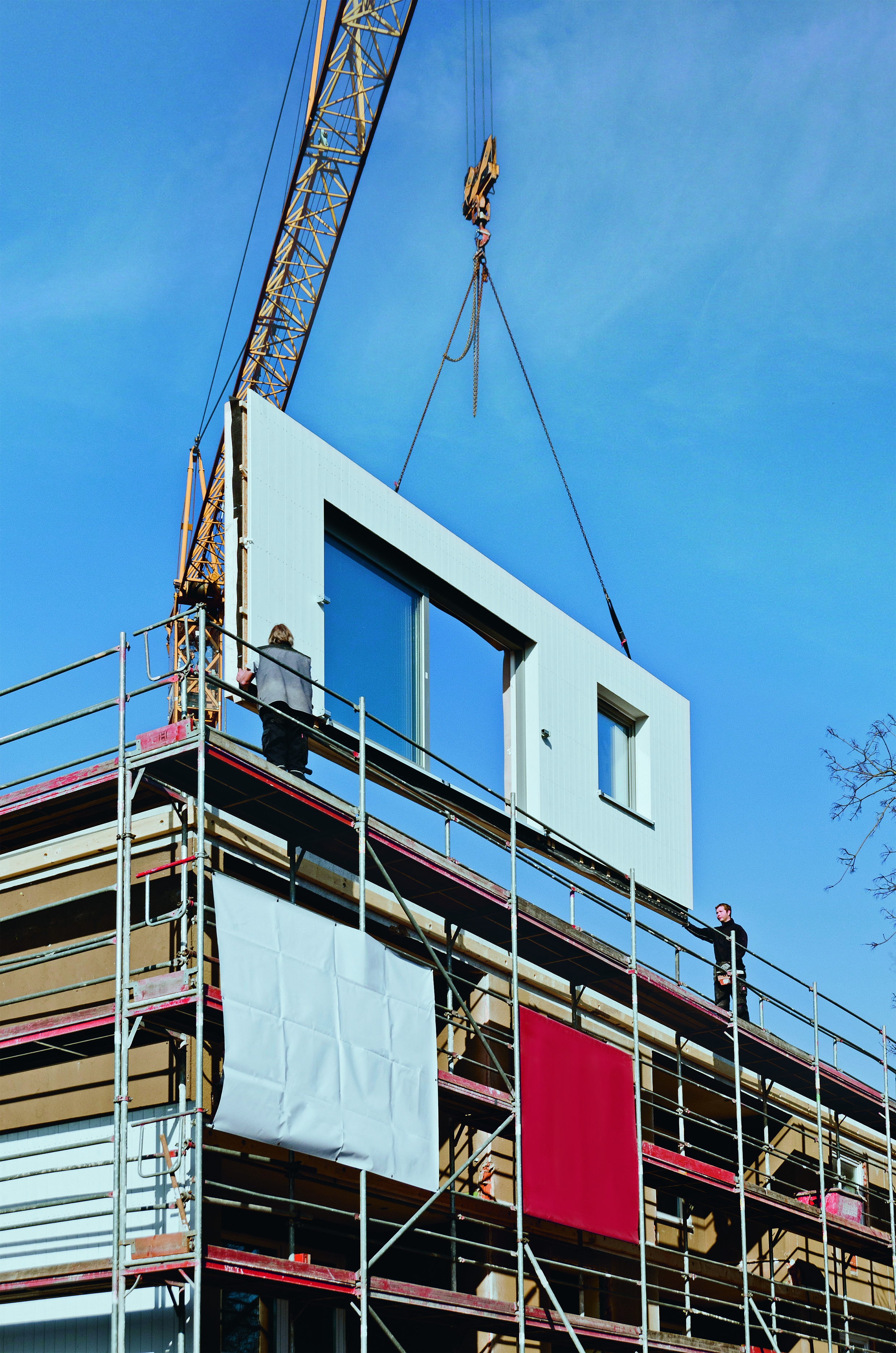 Holz ist eine Schlüsseltechnologie für nachhaltiges Bauen: Als Rohstoff punktet es im Vergleich zu anderen mit einem geringen Anteil an grauer Energie, es ist kreislauffähig, CO2-neutral und wächst in heimischen Wäldern nach. Dank technologischer Entwicklungen erschliesst Holz sich auch neue Einsatzgebiete wie den Hochhausbau. Darüber hinaus bietet der vorgefertigte Holzbau perfekte Lösungen für die Verdichtung im urbanen Raum, einer wesentliche Bauaufgabe der Zukunft: Die witterungsgeschützte Fertigung in der Produktionshalle sorgt für kurze Umsetzungszeiten in dicht verbauten Gebieten und damit für eine reduzierte Belastung der Nachbarschaft; Just-in-Time-Anlieferung grossformatiger Elemente ermöglicht den Baubetrieb auch bei begrenzten Platzverhältnissen.