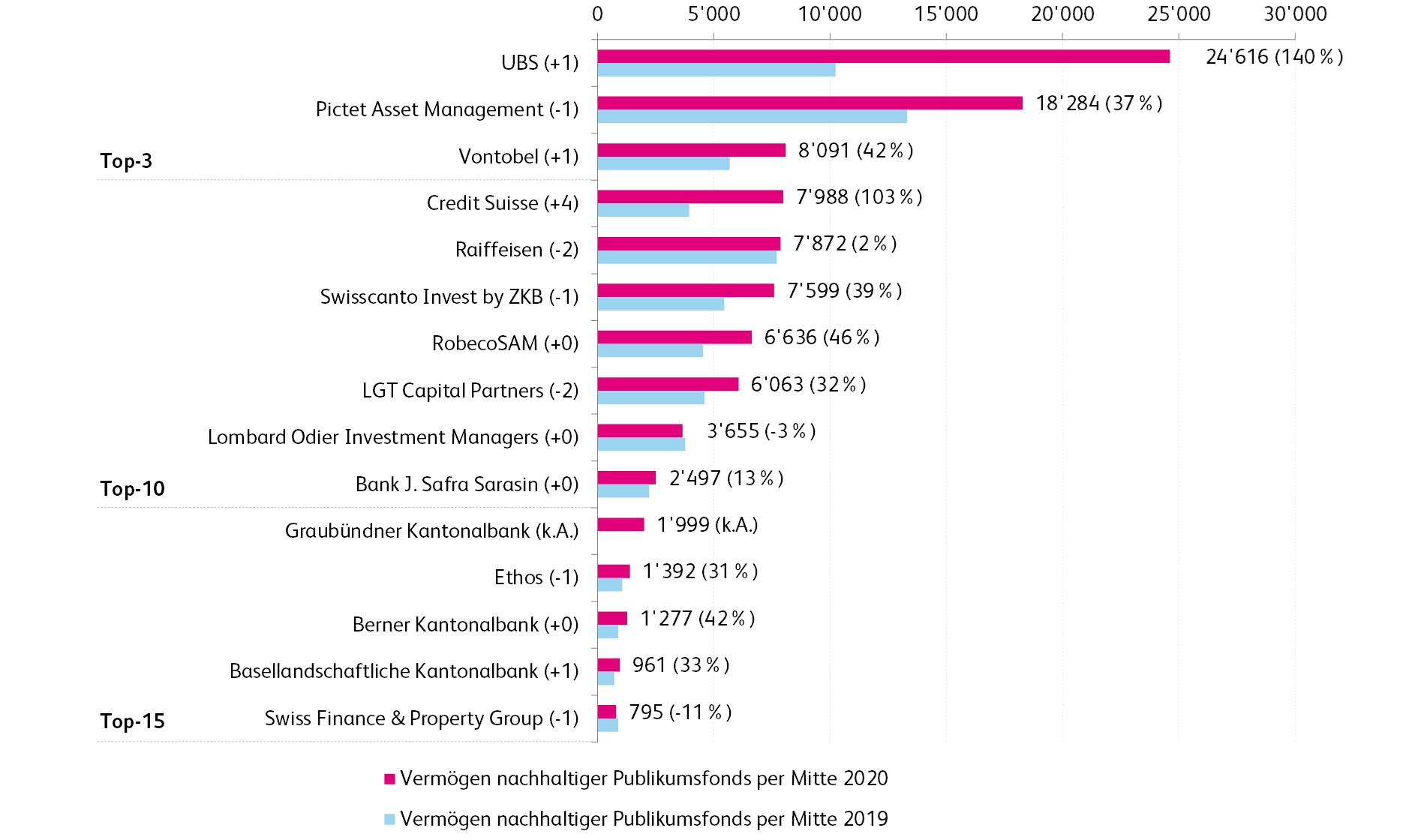 Nachhaltige Investments sind die Gewinner der Corona-Krise: Das Angebot an nachhaltigen Publikumsfonds wächst im Vergleich zum Vorjahr von 595 auf 777 Fonds (+31 Prozent). Die darin verwalteten Vermögen steigen von 198 auf 316 Milliarden Franken (+60 Prozent) – und dies, obwohl der Gesamtmarkt stagniert (Abbildung 1). Knapp sechs Prozent aller Fondsvermögen sind nachhaltig investiert. In der Summe ist das deutlich weniger als die hohe mediale Präsenz des Themas erwarten lässt. Jeder vierte Franken, der neu investiert wird, wird heute allerdings nachhaltig angelegt. Um diese Neugeldzuflüsse herrscht unter den internationalen und Schweizer Anbietern ein intensiver Wettbewerb (Abbildung 2 und Abbildung 3).