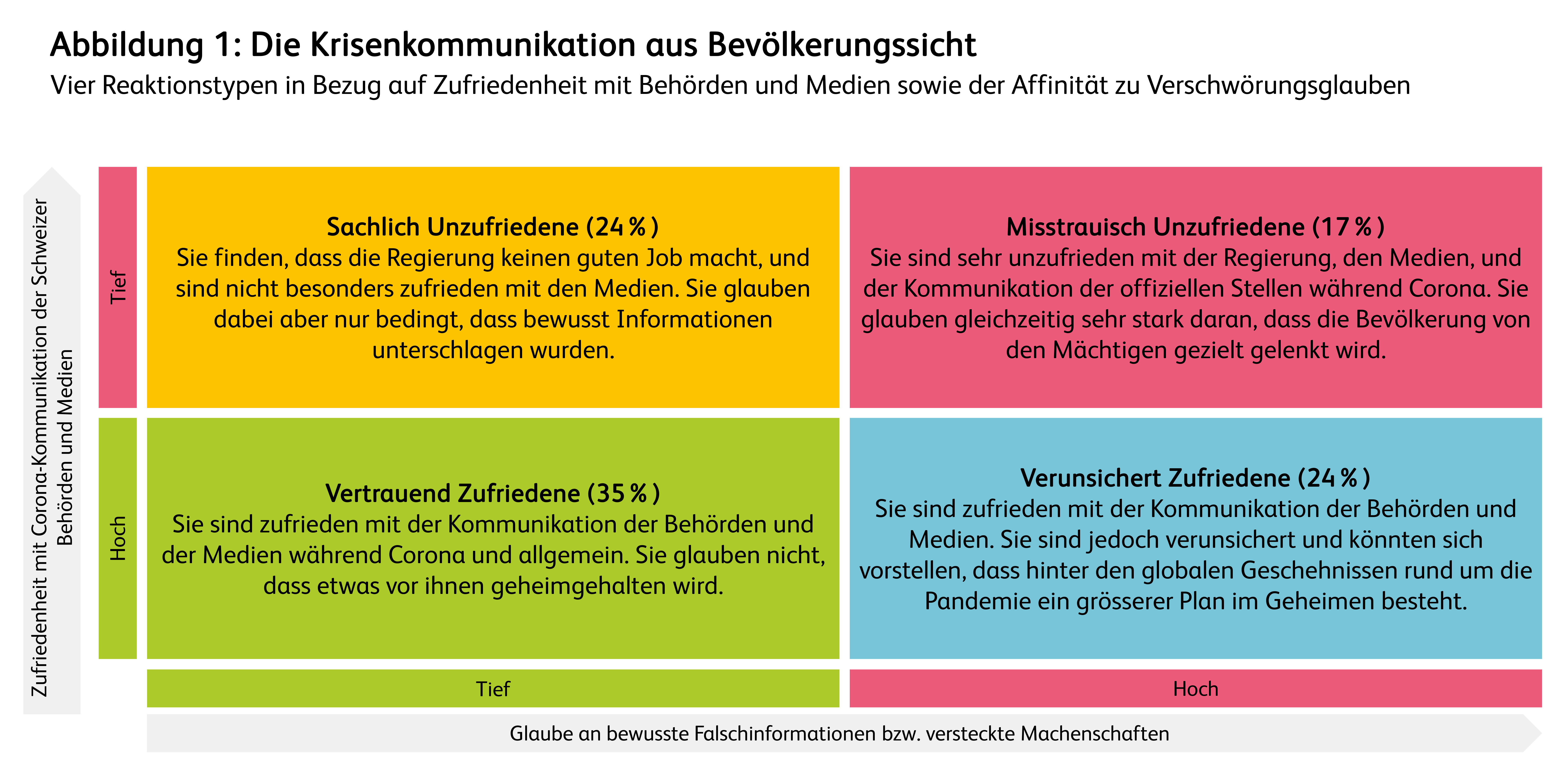 Rund 60 Prozent der Bevölkerung ist mit der Corona-Kommunikation der Behörden und Medien zufrieden. Auch unter den Zufriedenen gibt es eine Gruppe, die verunsichert ist und sich grundsätzlich vorstellen kann, dass hinter den globalen Geschehnissen ein grösserer Plan steckt. Diese Gruppe der verunsichert Zufriedenen macht rund ein Viertel der Bevölkerung aus (Abbildung 1: Die Krisenkommunikation aus Bevölkerungssicht – Vier Reaktionstypen; zum Vergrössern klicken).
